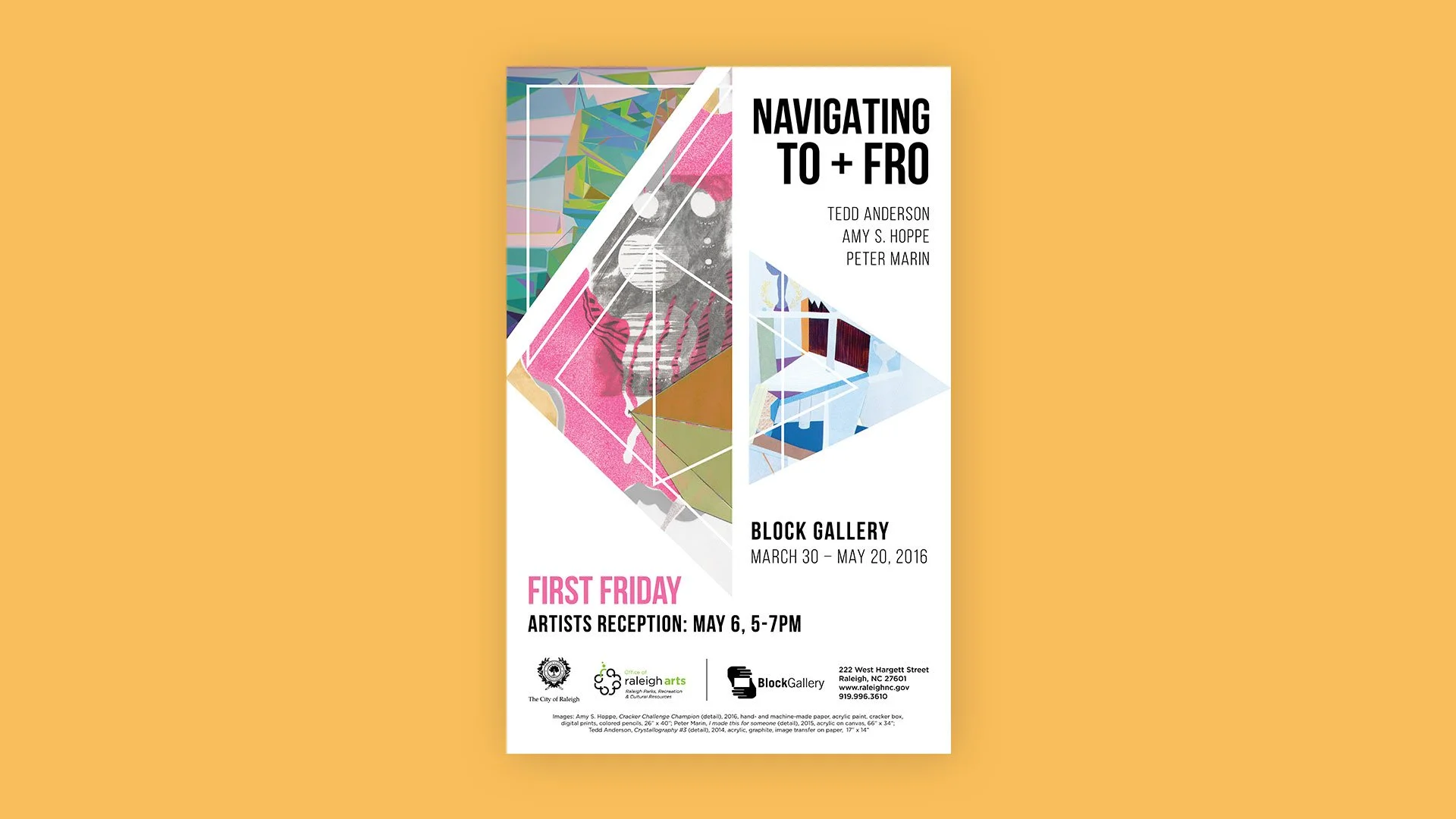 The Block Gallery is a small exhibition gallery in the heart of Raleigh, NC that focuses on local artists. I worked with the head curator to revamp the overall art direction for the gallery’s marketing materials to make them more eye-catching and to highlight the artwork in a way that felt unique to the gallery.